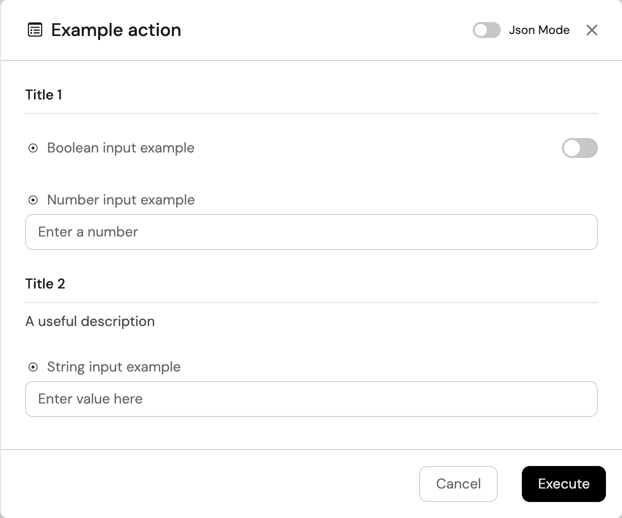 Actions can contain a variety of input types, including text fields, dropdowns, numbers, and much more.