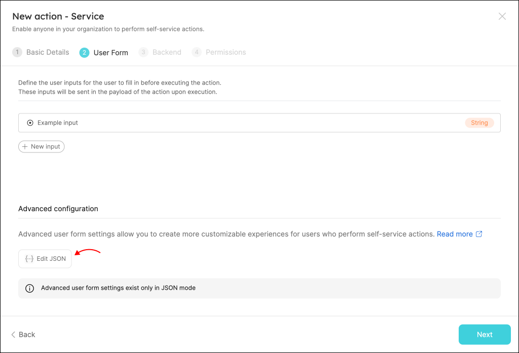 When creating an action, the second step is defining its inputs. After defining at least one input, an Advanced configuration section will appear in the bottom of the form. Click on Edit JSON, then add your configuration in JSON format.