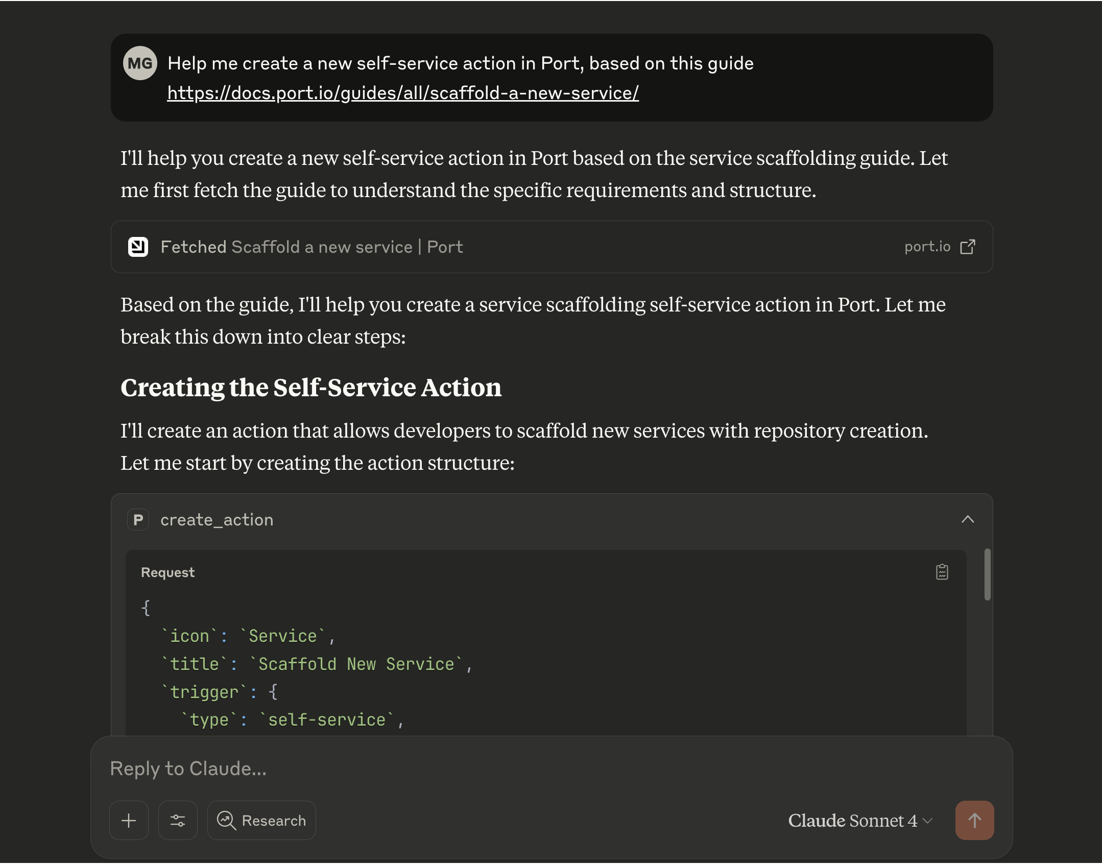• Ask: "Create a new self-service action in Port to scaffold a new service"