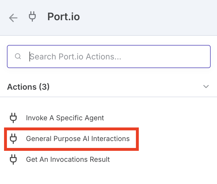 4. Select a Port node — Click the "Port.io" search result and select "General Purpose AI Interaction" (this is the easiest one to test with).