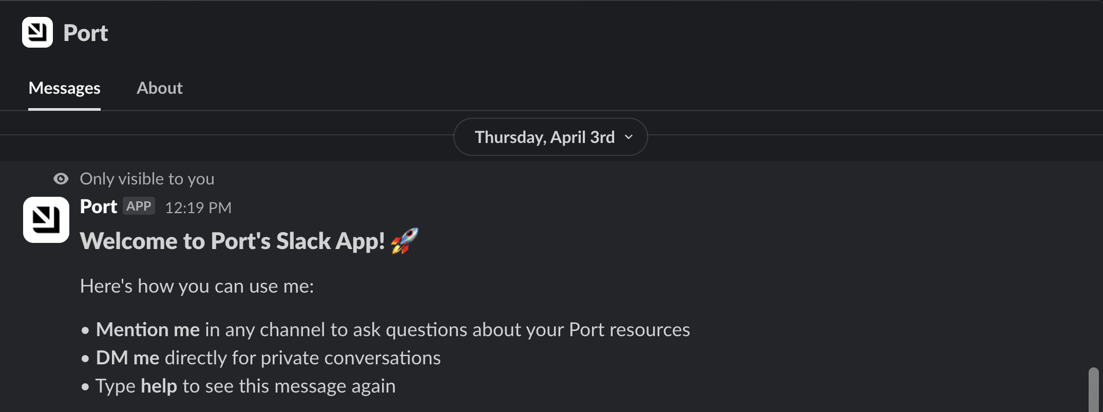 • Once installed, you will receive a Slack message from Port's bot with a summary of the app's capabilities: