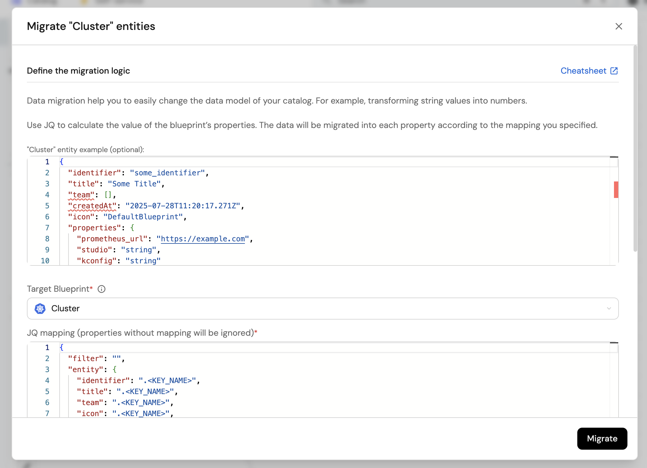 Before executing the migration, you can review a summary of the planned changes. This includes a preview of how entities will look after migration, allowing you to verify that all mappings are correct and JQ checks out.