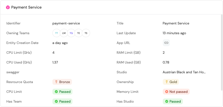 This widget displays information about a specific entity, including its properties and scorecard compliance.