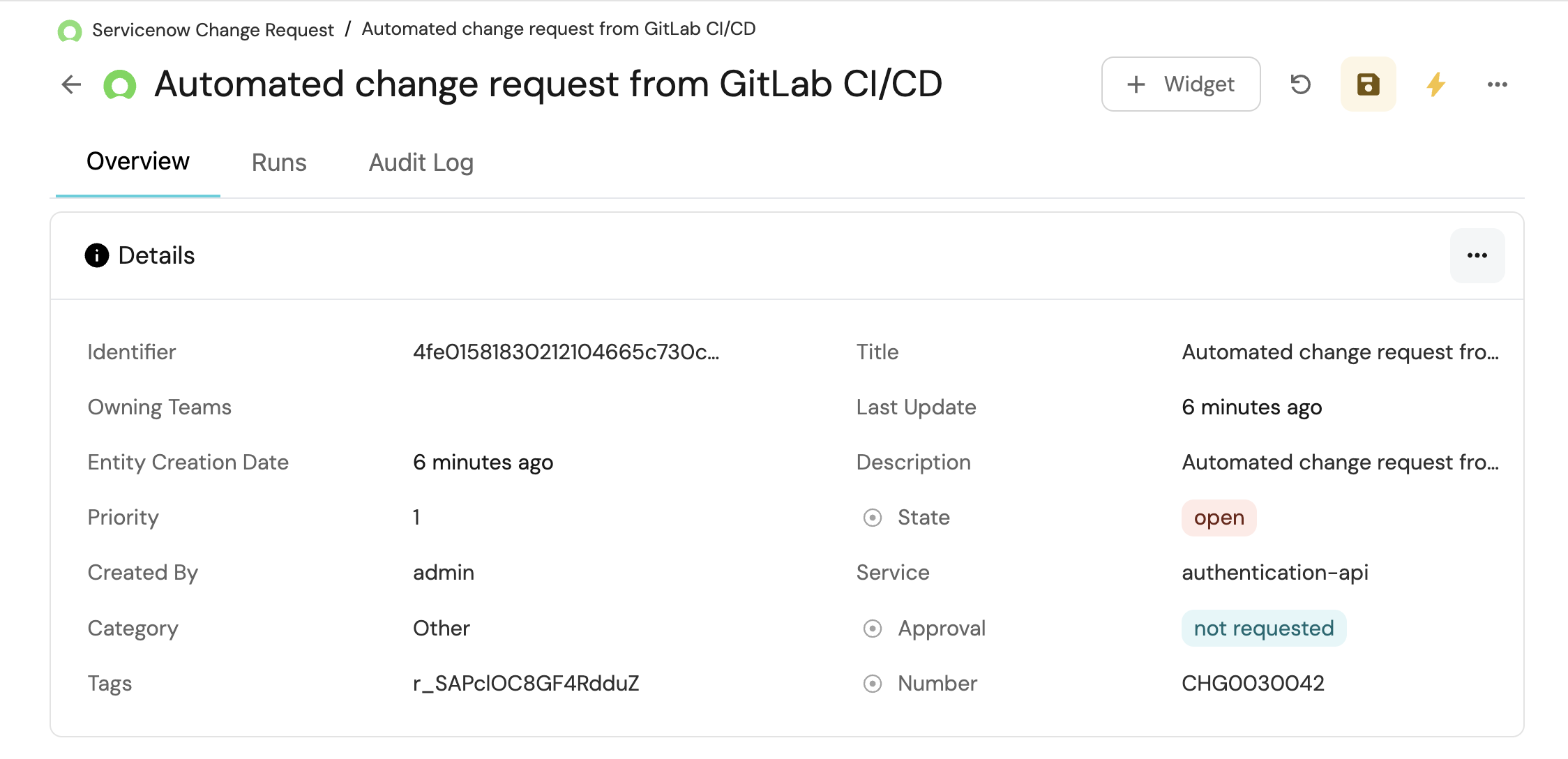 -d "{\"short_description\": \"Automated change request from GitLab CI/CD\", \"business_service\": \"$serviceEntity\", \"priority\": \"1\", \"u_external_tag\": \"$DEPLOY_ACTION_RUN_ID\"}" \