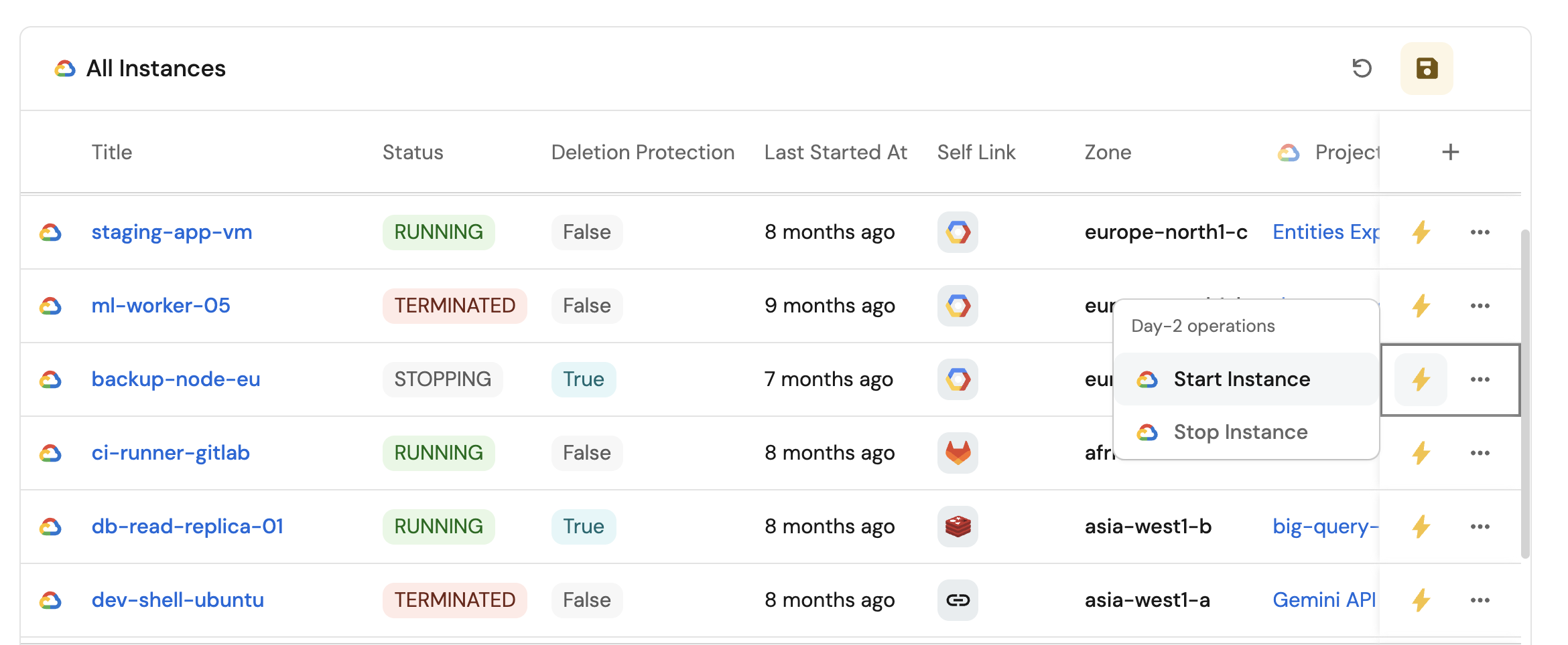 Instances without deletion protection(add theGoogleCloudicon). - Select
