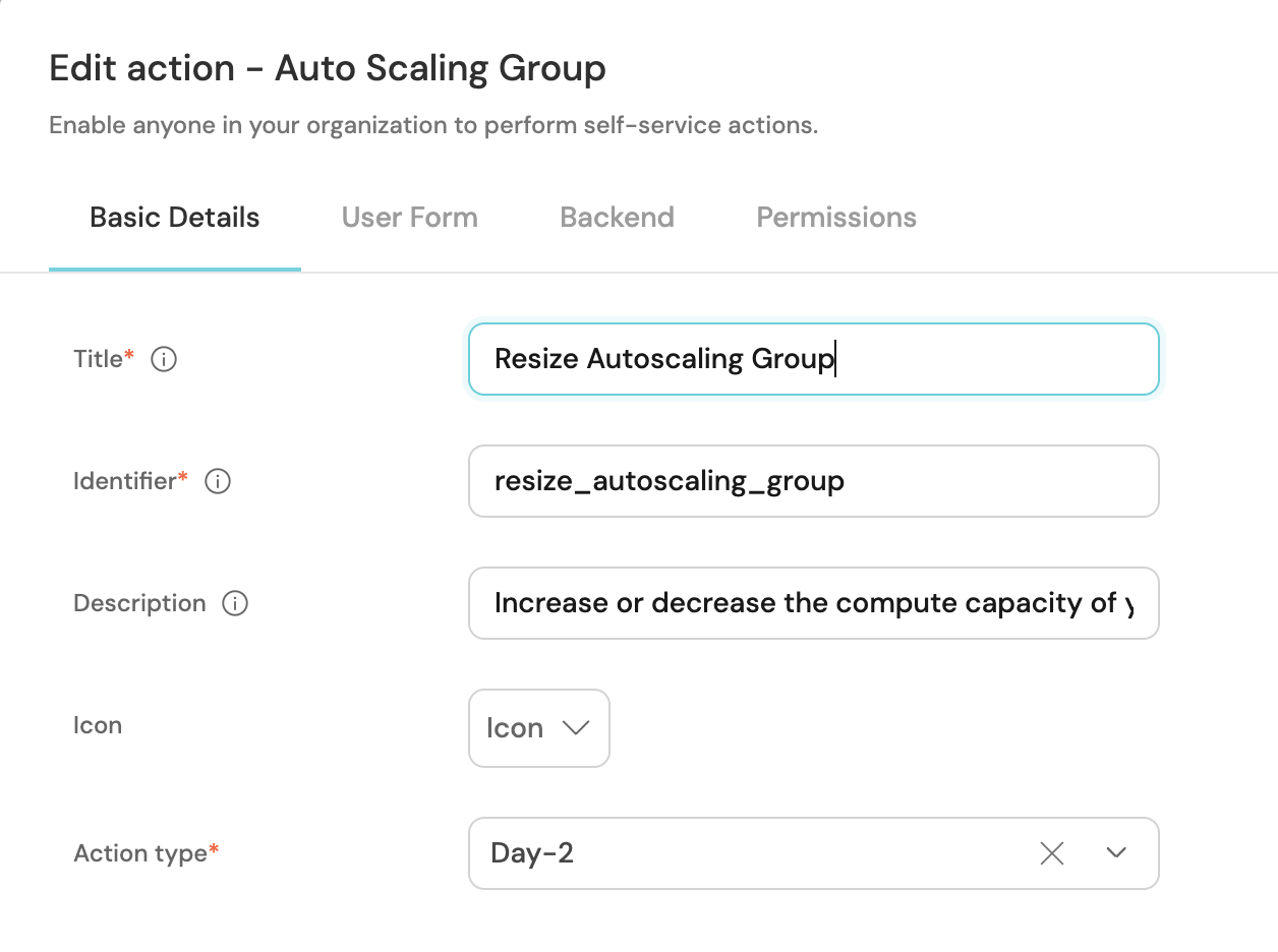 ec2Instanceblueprint: - Head to the self-service page. - Click on the+ New Actionbutton. - Click on the{...} Edit JSONbutton. - Copy and paste the following JSON configuration into the editor: