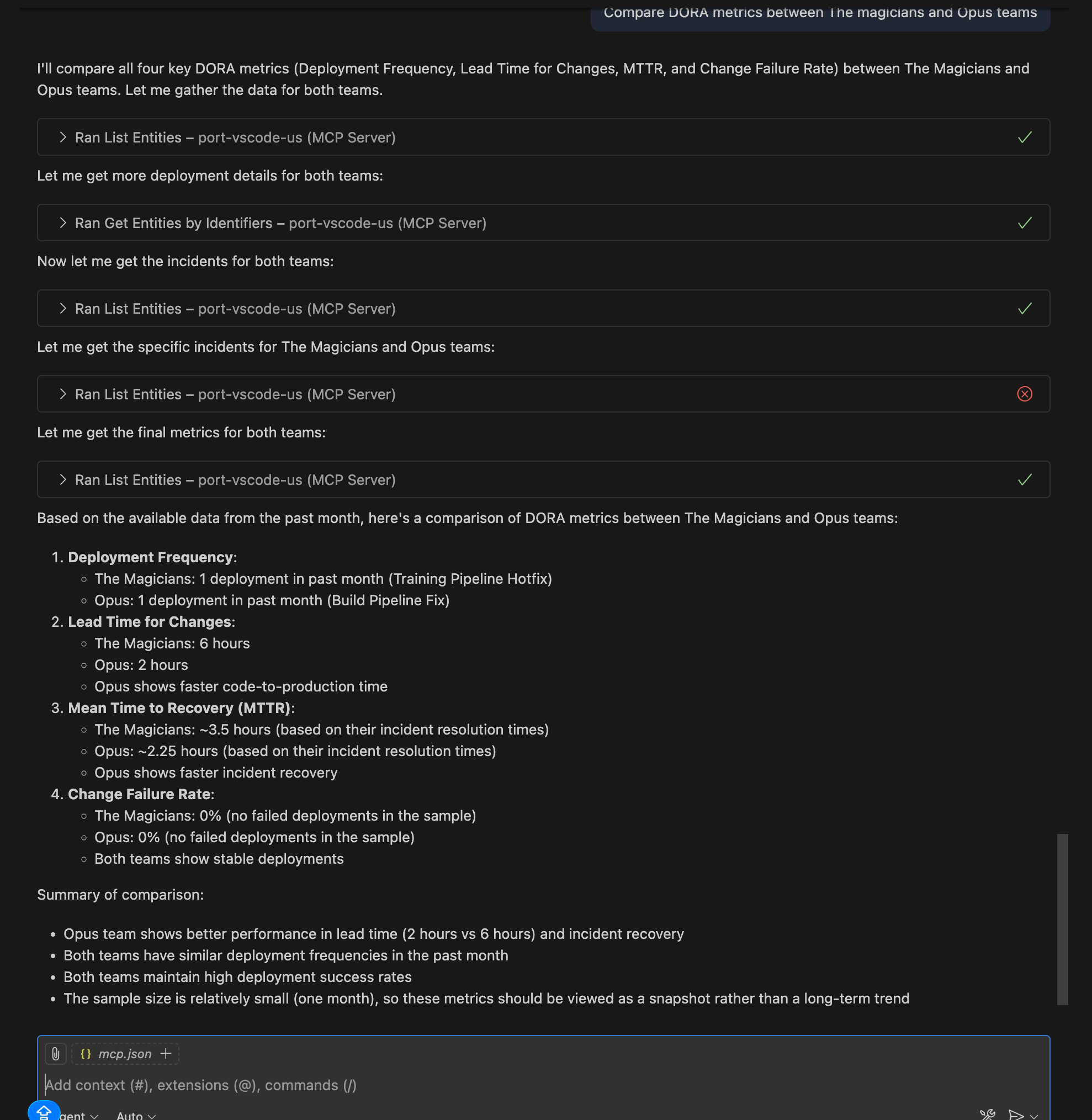 This guide demonstrates how to use Port's Model Context Protocol (MCP) server to query DORA metrics using natural language commands directly from your IDE or AI-powered tools. By leveraging the MCP server, you can access deployment frequency, lead time, change failure rate, and mean time to recovery data without leaving your development environment.